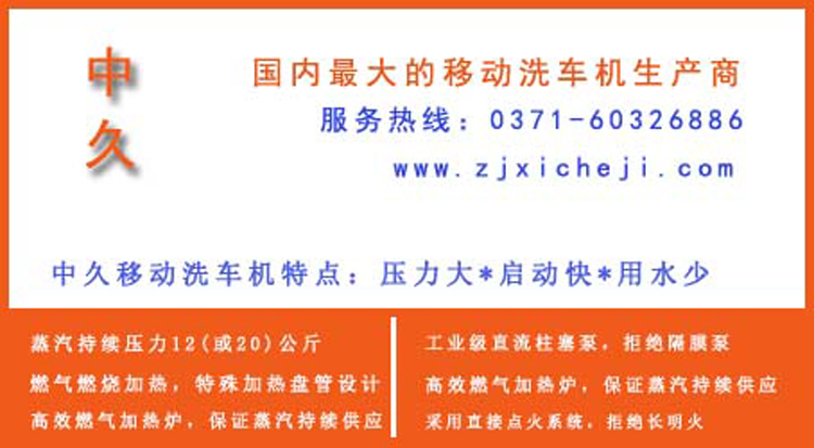 鄭州中久環保技術有限公司主要經營蒸汽洗車機等系列設備,本公司致力于產品的開發,制造和銷售,給客戶以高端的設備和良好的售前,售中,售后服務,具體內容如下: